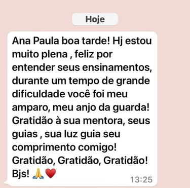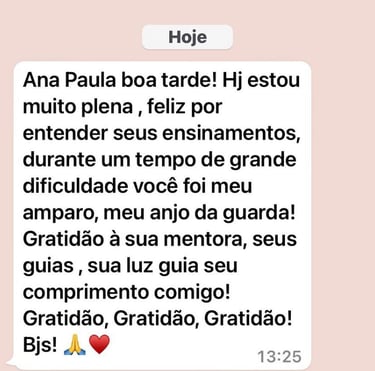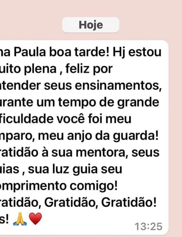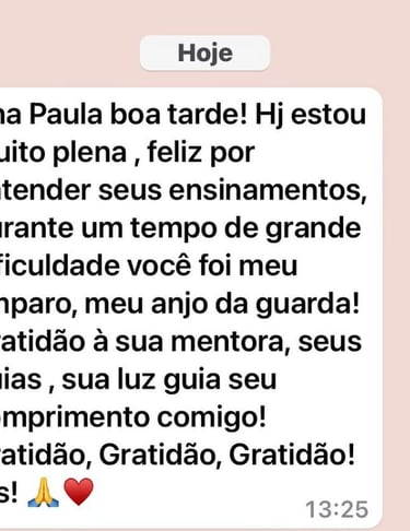 ”Hoje estou muito plena, feliz por entender seus ensinamentos. Durante um tempo de grande dificuldade você foi meu amparo, meu anjo da guarda!”