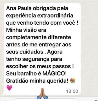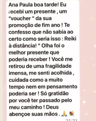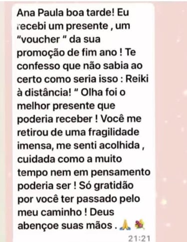 ”Te confesso que não sabia ao certo como seria isso: Reiki à distância. Olha foi o melhor presente que poderia receber. Você me retirou de uma fragilidade imensa, me senti acolhida, cuidada, como a muito tempo nem em pensamento poderia ser”